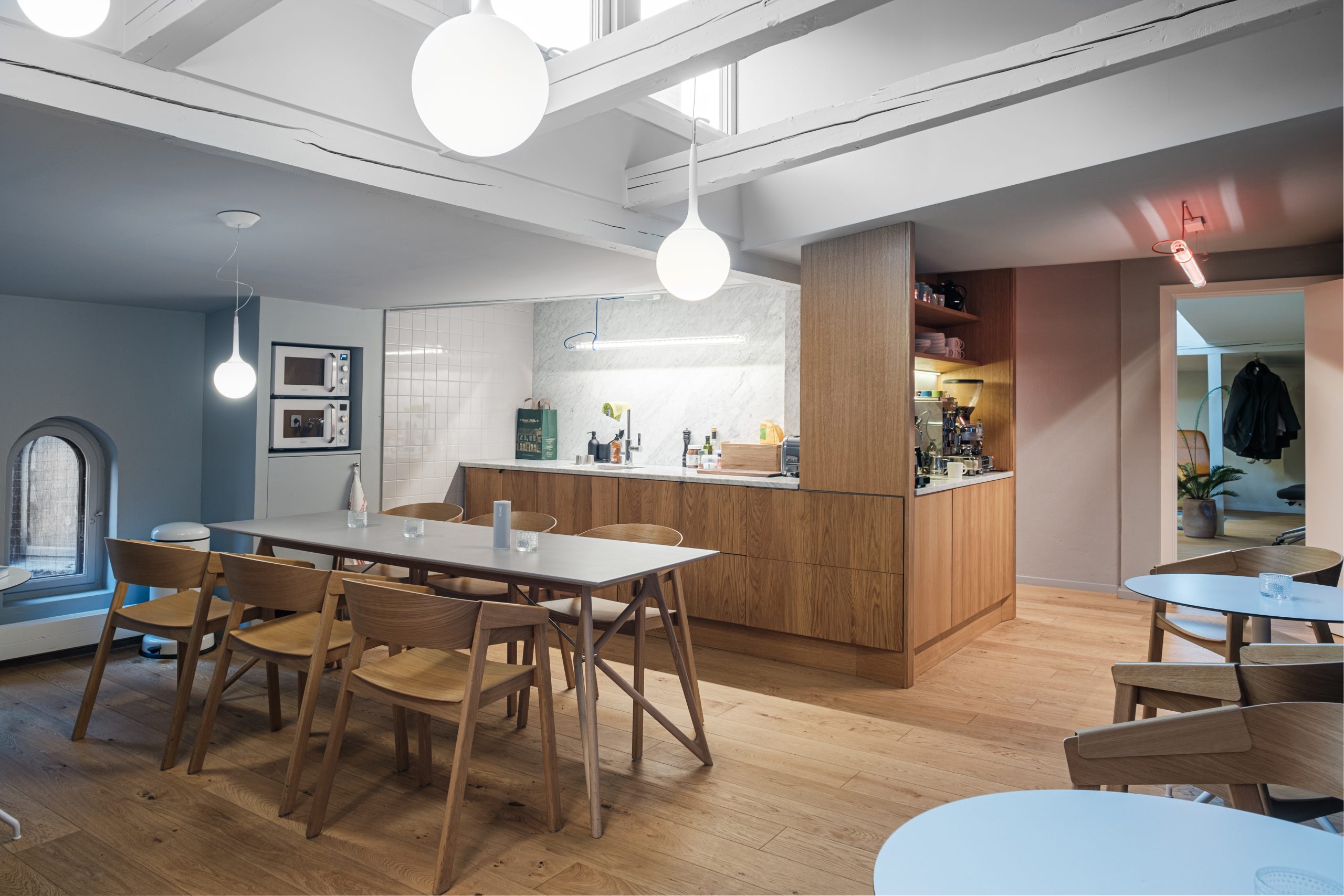 Gamla material byttes ut mot nya där fokus låg på att skapa enhetlighet och kvalitet. Nytt ekgolv, fast inredning i trä och nya ytskikt har tillkommit. Lokalen är nu ljus och öppen och rymmer två kontor, ett större mötesrum och sällskapsyta. Välkommen upp!