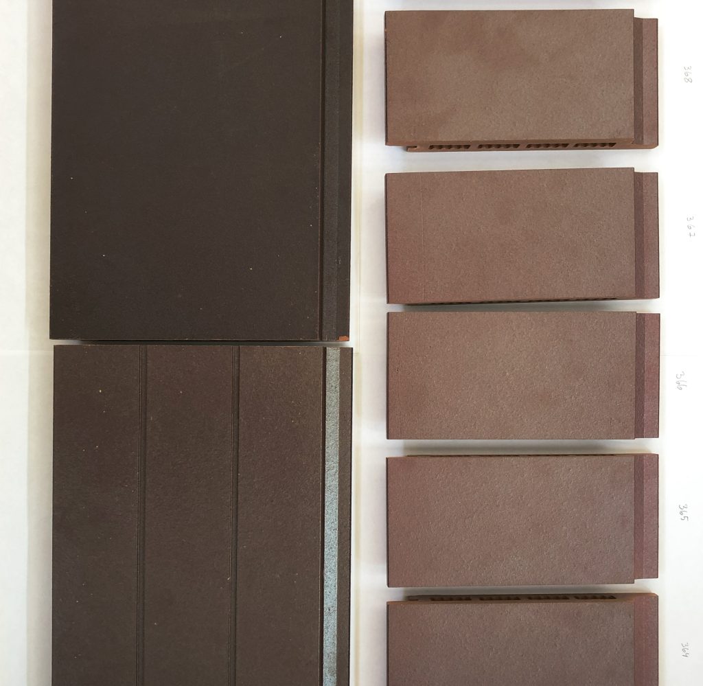 Skärmteglet tillverkas i Tyskland och har tagits fram specifikt för projektet, med unika glasyrer och strukturerade ytor som speglar den ursprungliga fasadens särpräglade indelning. För att hitta rätt kulör och glans på skärmteglet har omfattande provbränningar genomförts och ett flertal mock-up-väggar har monterats.  Genom att kombinera blanka, räfflade plattor med matta, släta skivor återskapas den ursprungliga fasadens repetitiva utformning och rytmik.