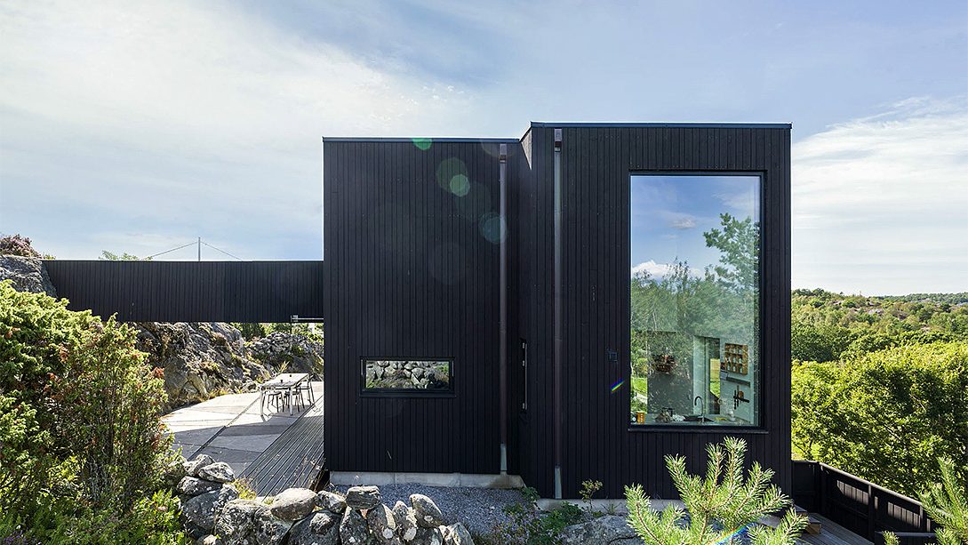 Vi ville inte göra ett hus som stack ut, utan vi ville göra det bra och enkelt. Ett fritidshus behöver inte vara så praktiskt och det kan vara en byggnad på sina egna villkor. Nu när huset är färdigt syns det knappt från vattnet. Det försvinner helt tack vare den svarta fasaden som suddas ut mot berget, som reser sig högre upp bakom huset. Från landsvägen får man bara en glimt av byggnaden när man passerar i bil.