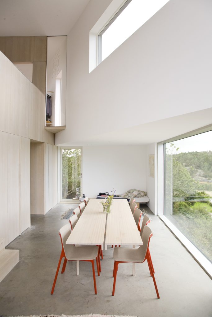 Huset på Flatön har ritats inifrån och ut, vilket har givit fönstren dess placering. Det mest anmärkningsvärda är nog det stora fönstret mot norr som är mycket medvetet placerat. Norrljuset ger rummet ett konstant ljus över hela dagen. I rum med fönster mot norr står tiden stilla, då norrljuset inte har något humör. Huset är som en stor låda. I den har en mindre låda placerats helt klädd i askfanér, som en stor möbel, där alla sovrum, badrum och förvaring finns. Resten är en stor rymd.